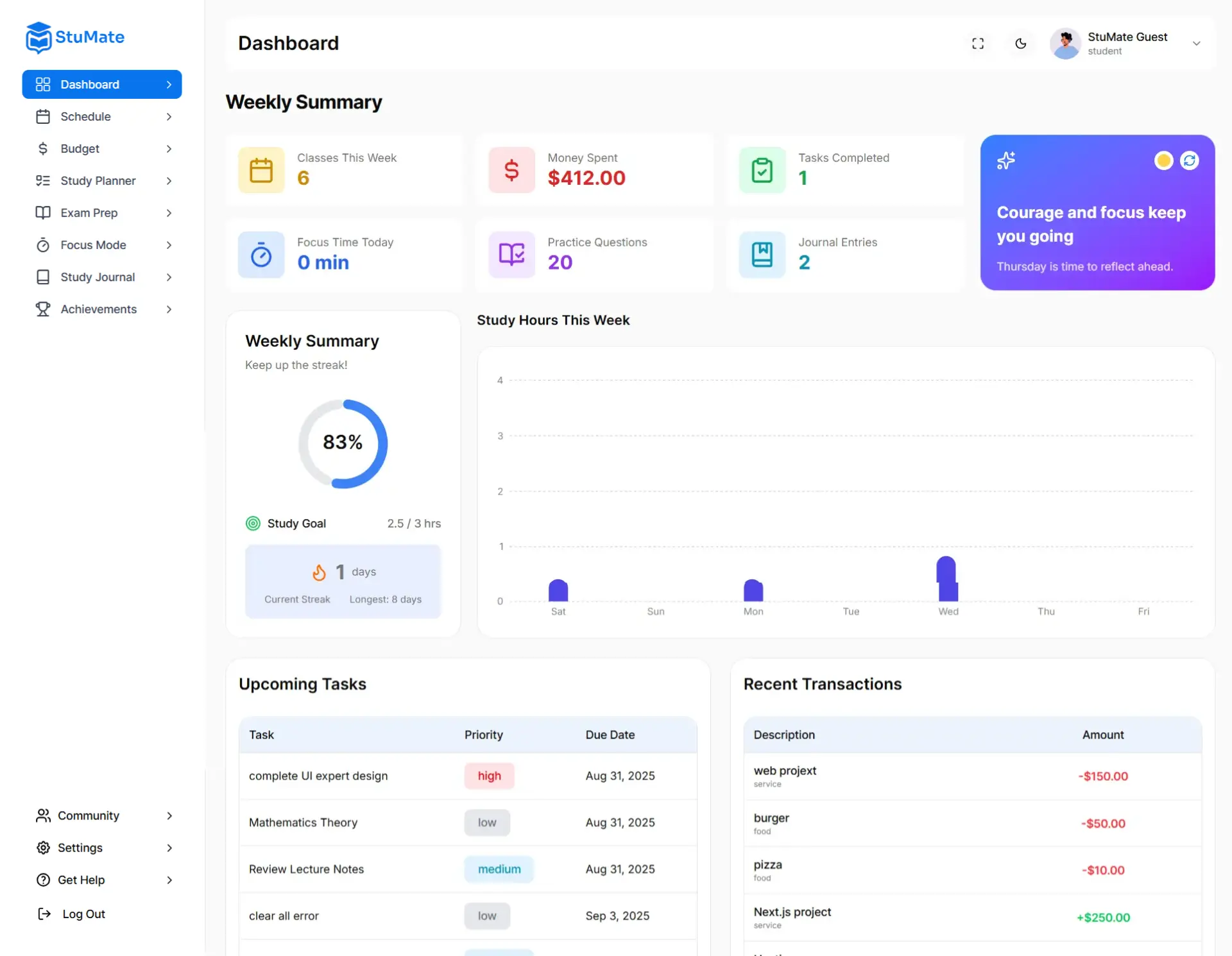 I was new to university life and felt lost. Stumate made it so easy to set up my schedule, track expenses, and stay focused.
